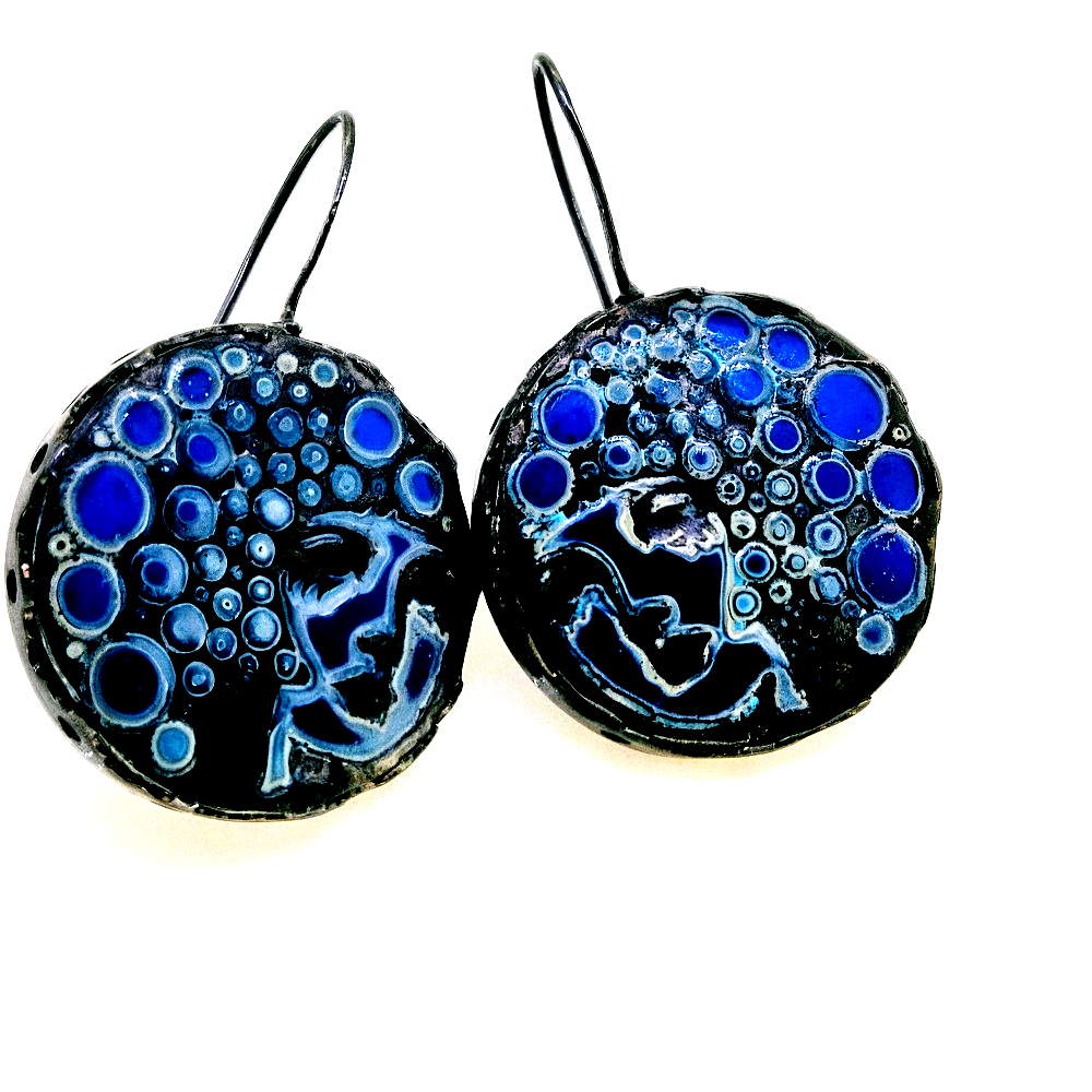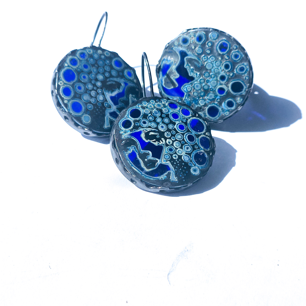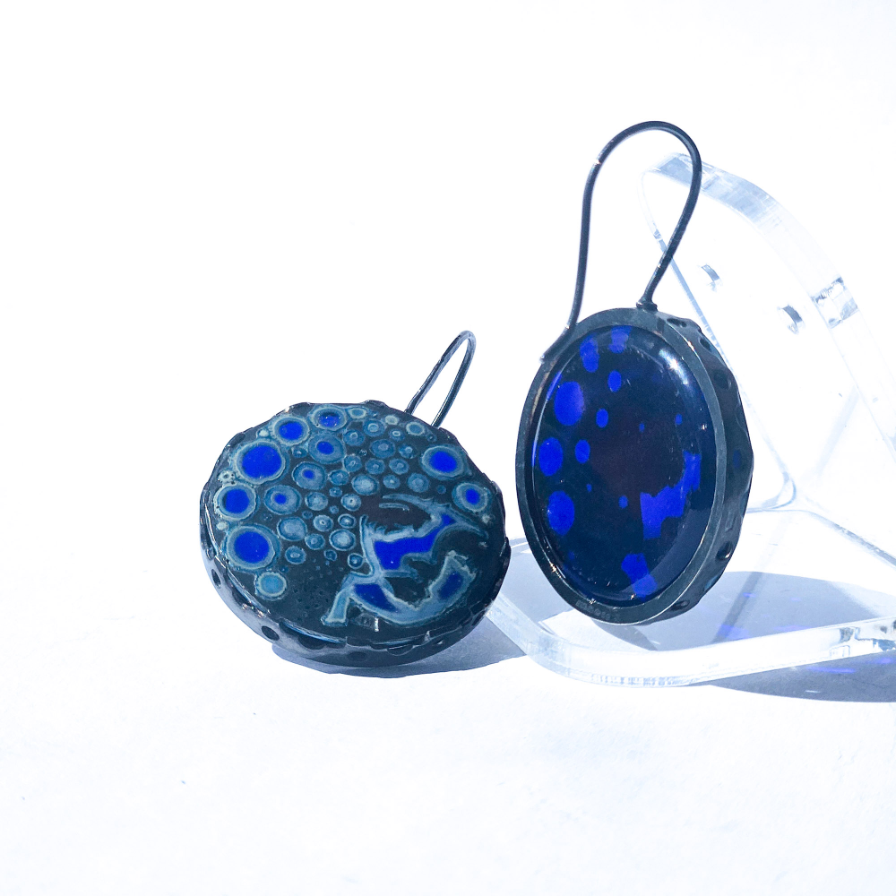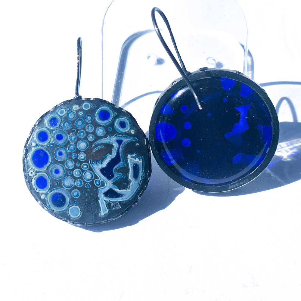 The glass jewels are made by fusing blue glass with sterling silver. Each resolves differently through the process. The settings and posts are made in sterling silver.