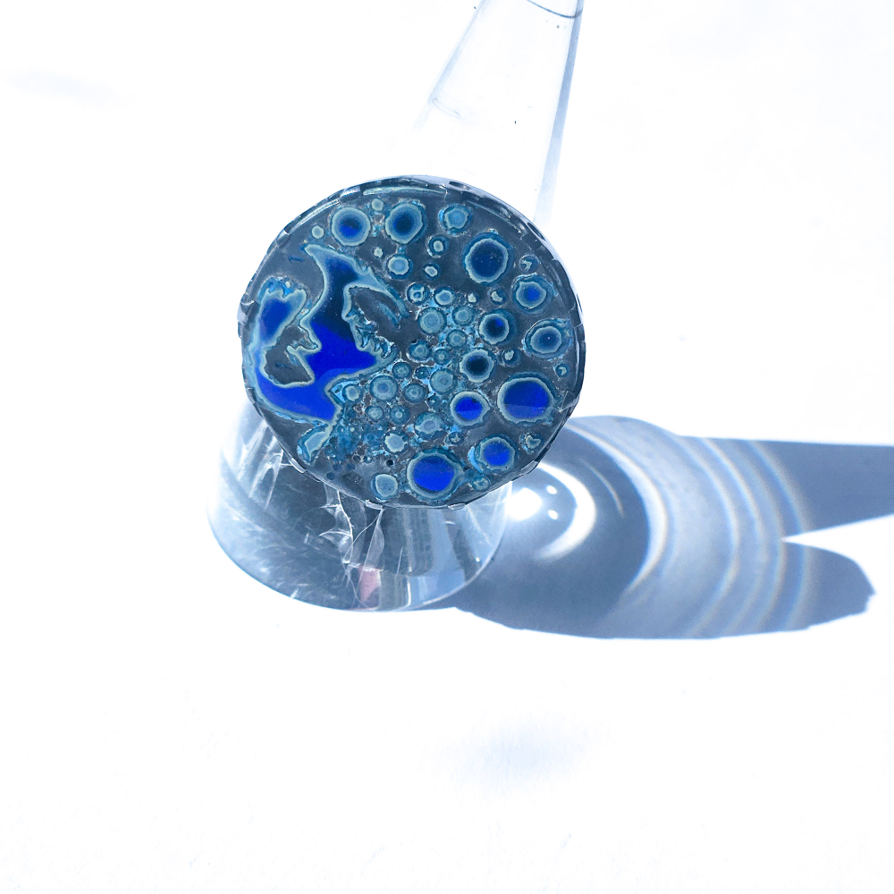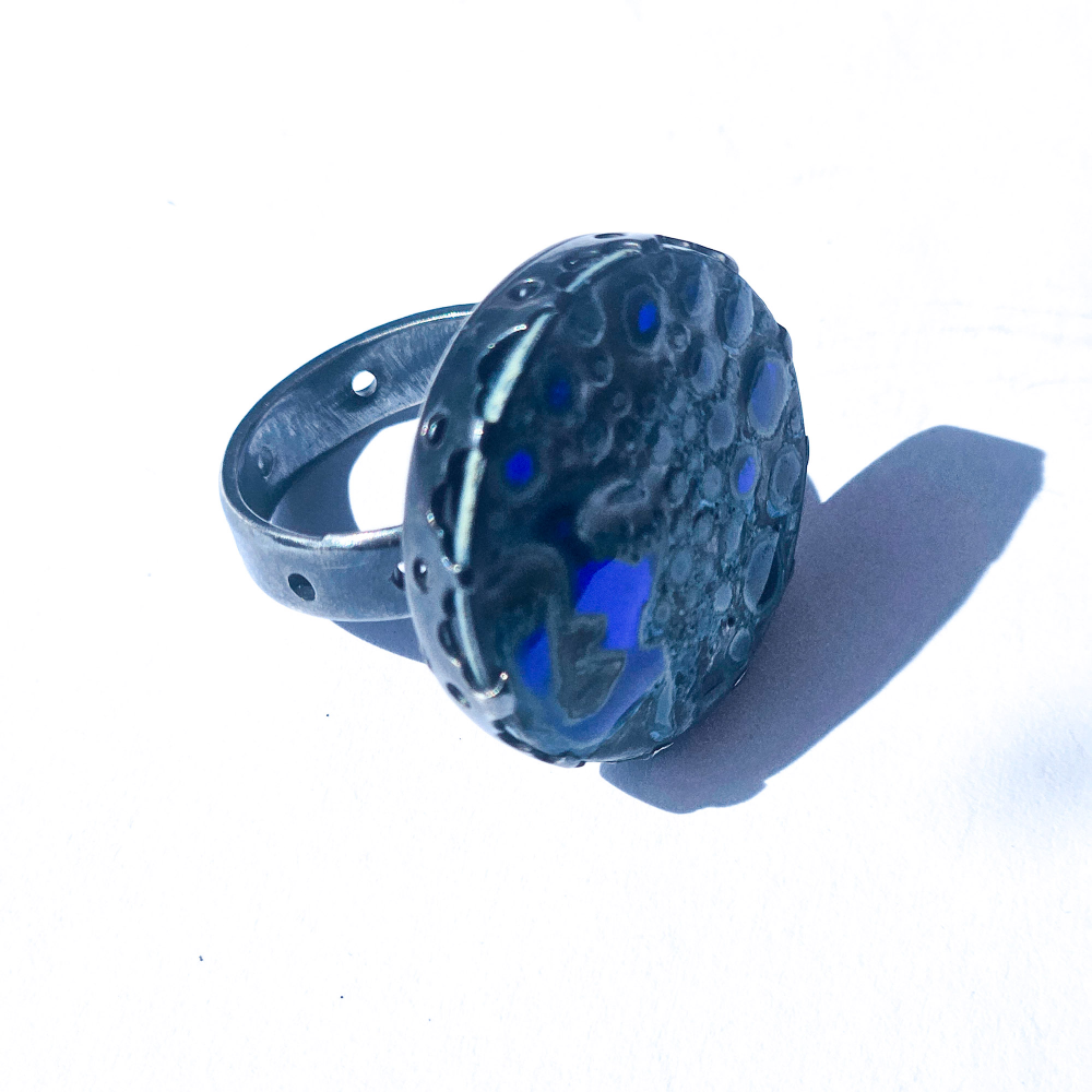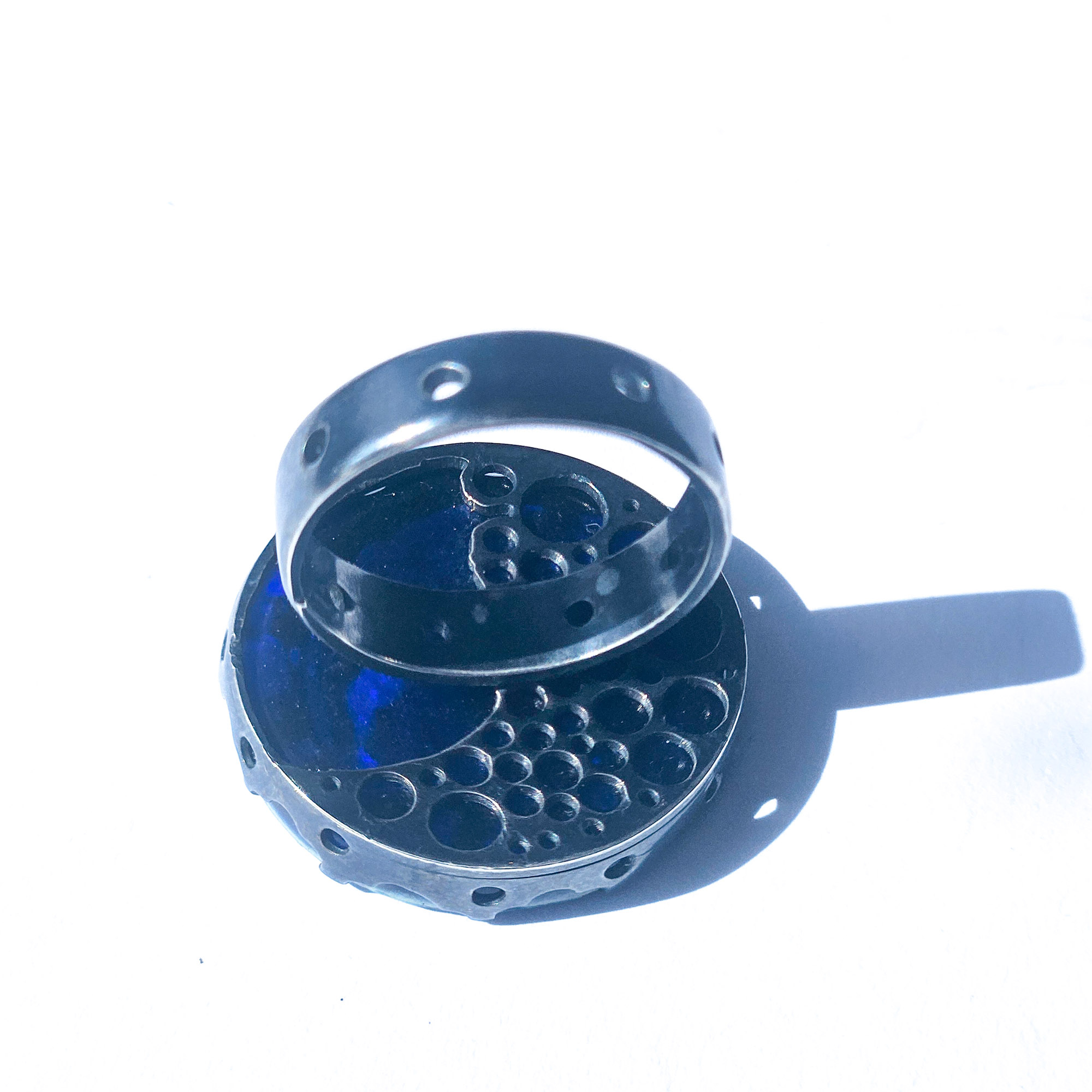 The glass jewel is made by fusing blue glass with hand-sawn sterling silver. The silver has been oxidised, giving a darker surface that contrasts with the glass. All elements are made by hand.