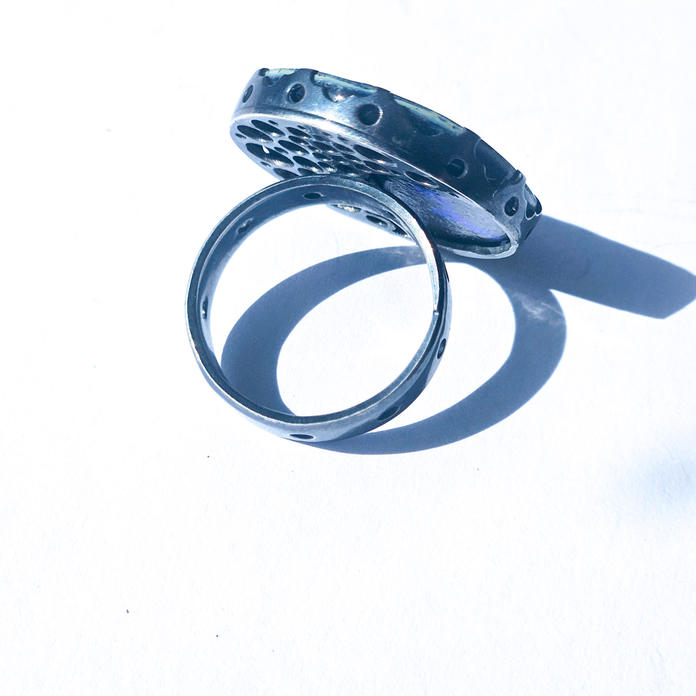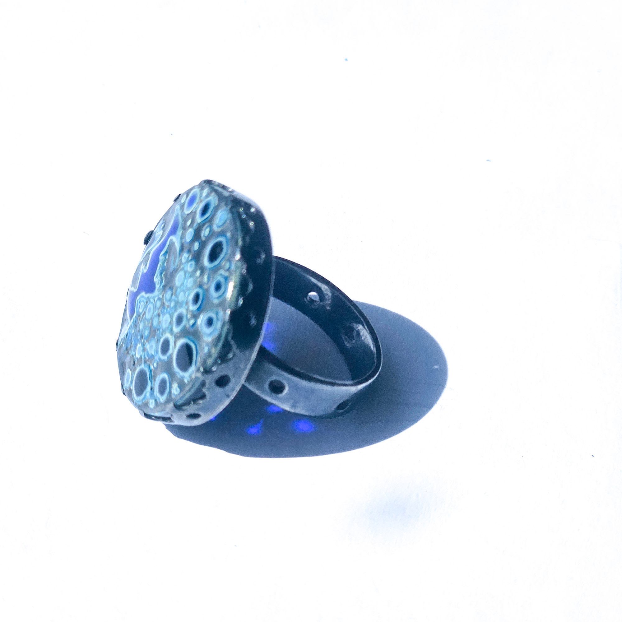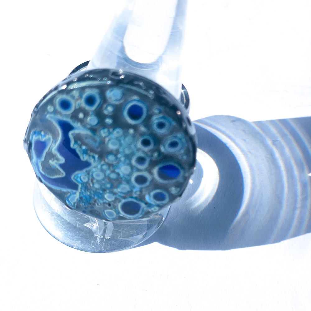 The glass jewel is made by fusing blue glass with hand-sawn sterling silver. The silver has been oxidised, giving a darker surface that contrasts with the glass. All elements are made by hand.