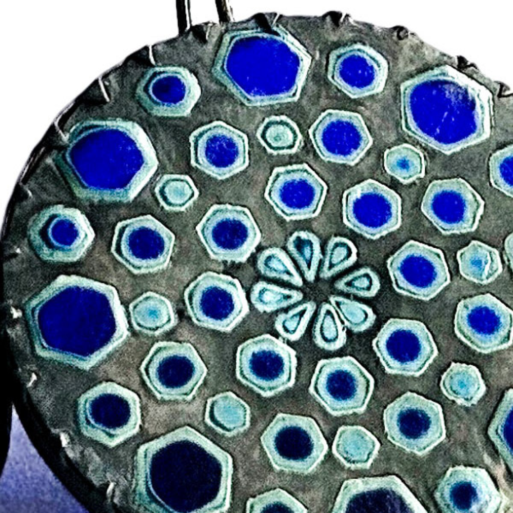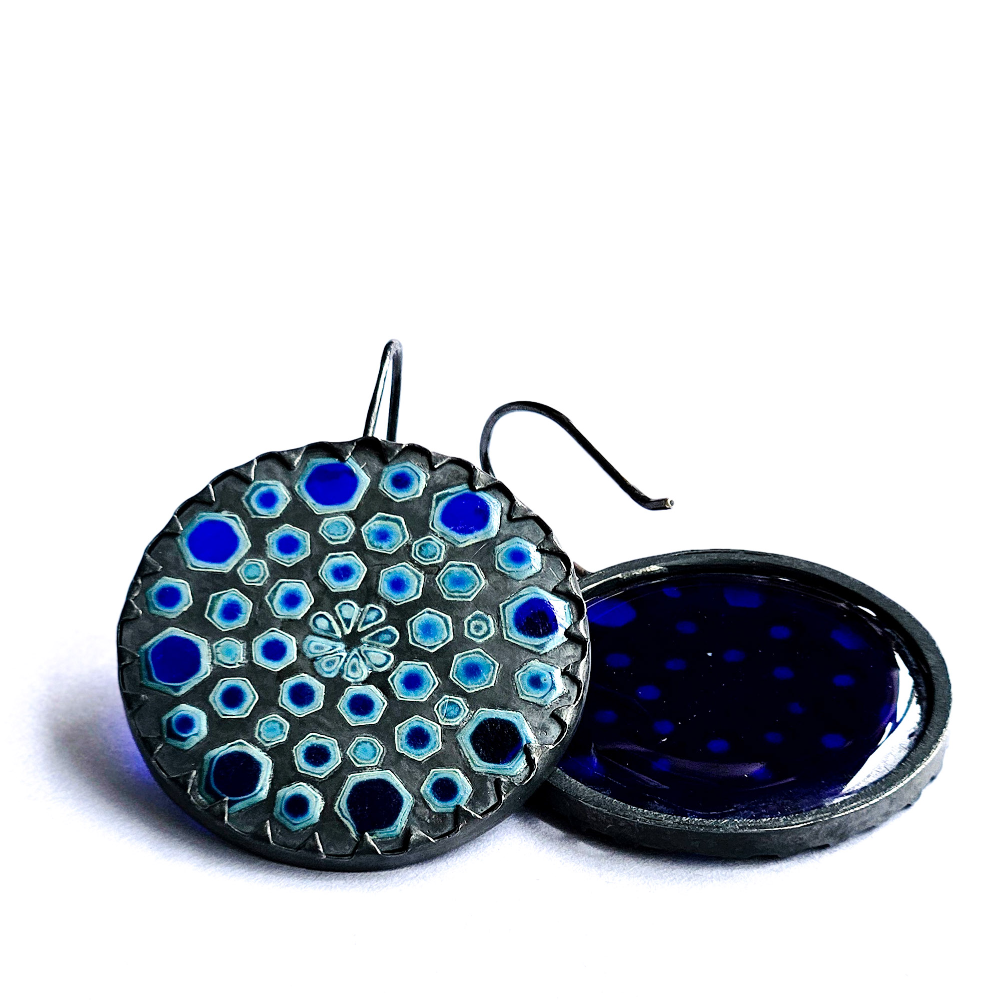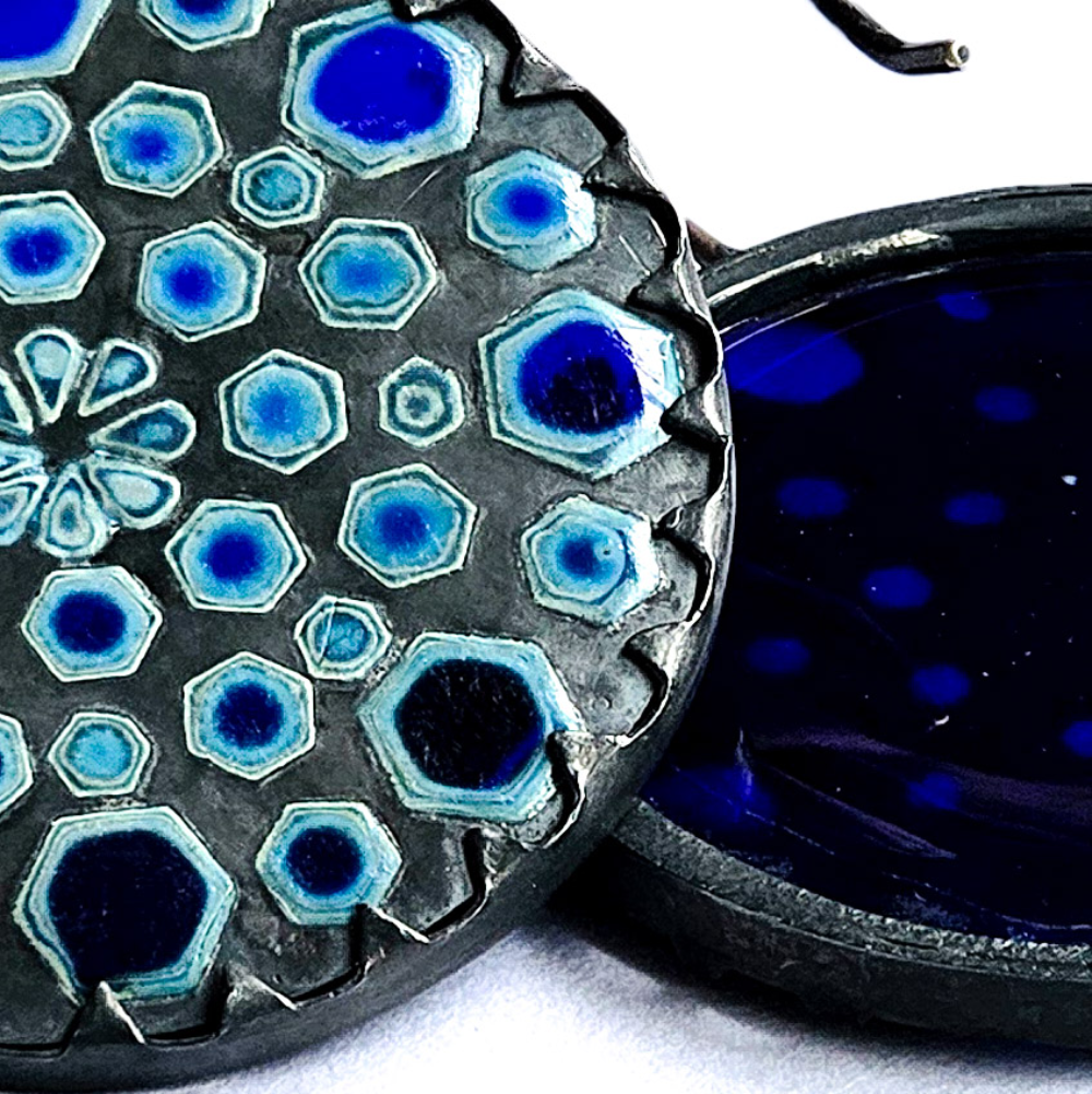 The glass is made by fusing blue glass with hand-punched and sawn silver, forming the Honeytrap design. The surface reveals a pattern of hexagonal forms with tonal variation, where the silver interacts with the glass during firing.