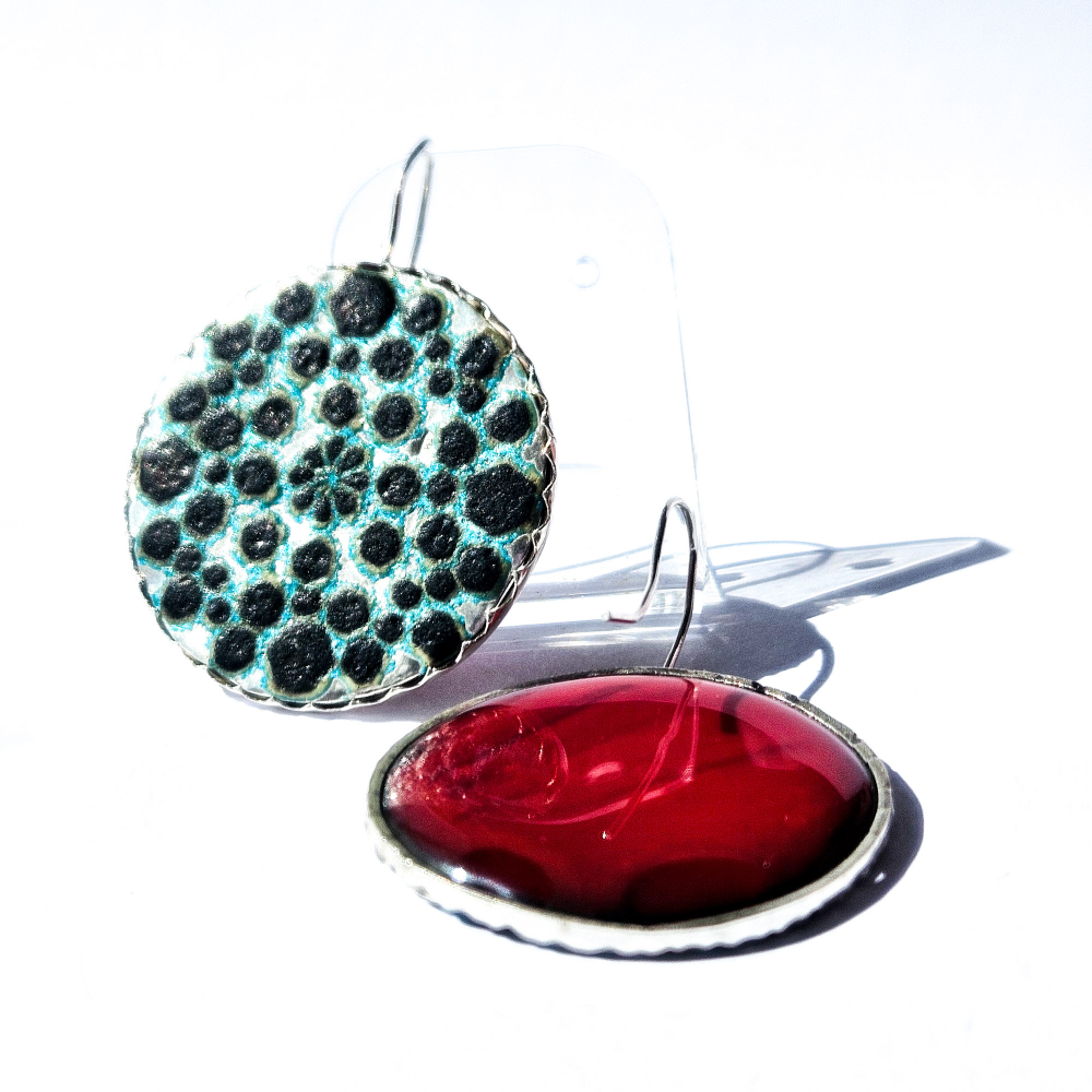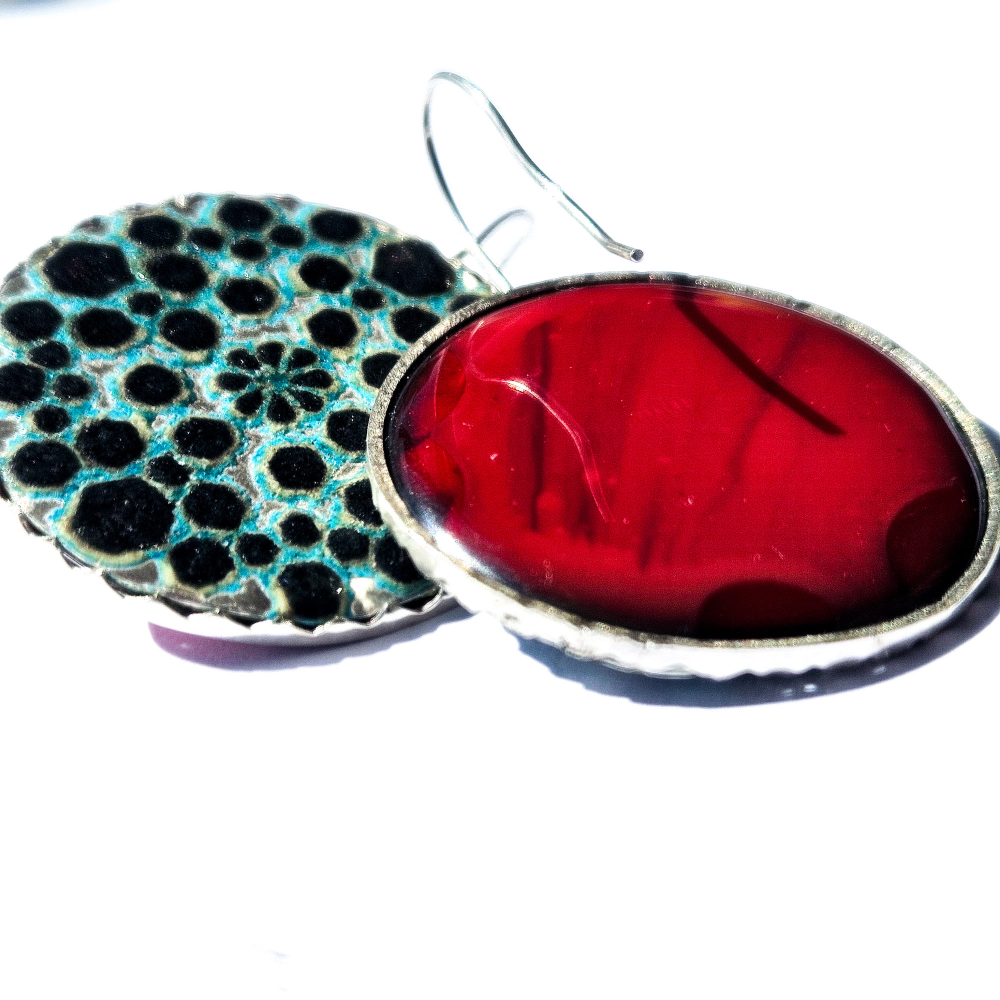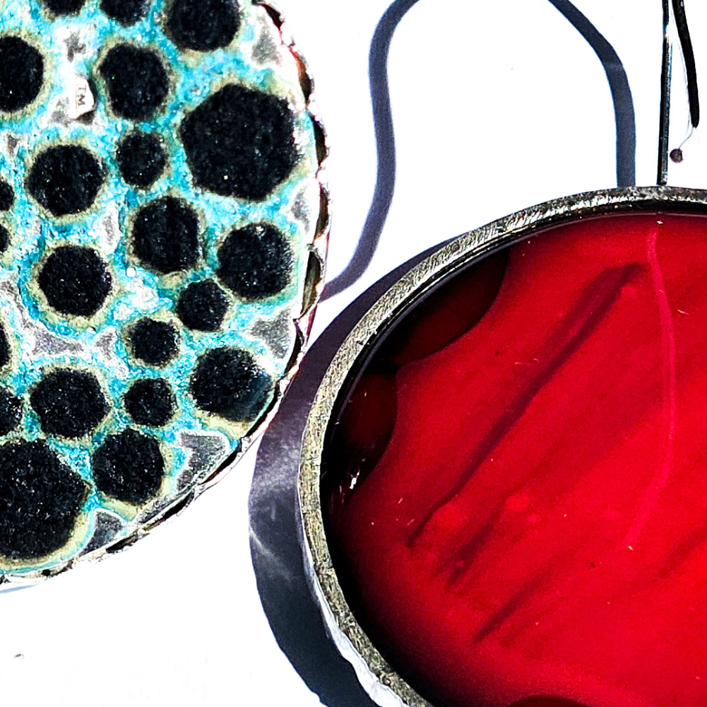The glass is made by fusing red glass with hand-punched and sawn sterling silver, forming the Honeytrap pattern. The silver on the surface reacts during firing to produce blue and green tones, creating contrast against the red glass beneath.