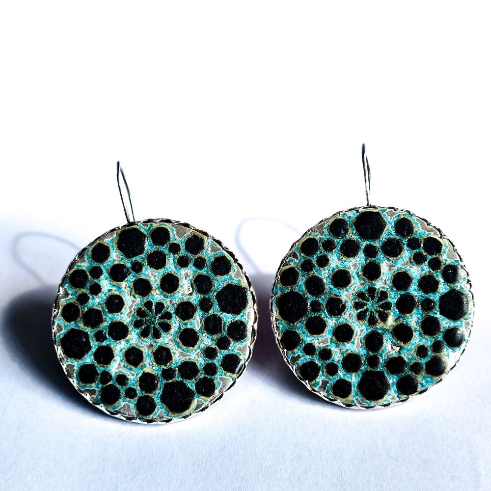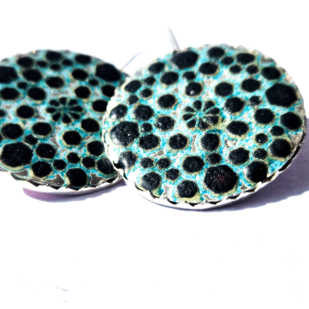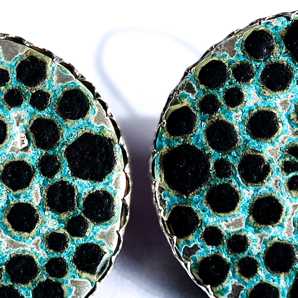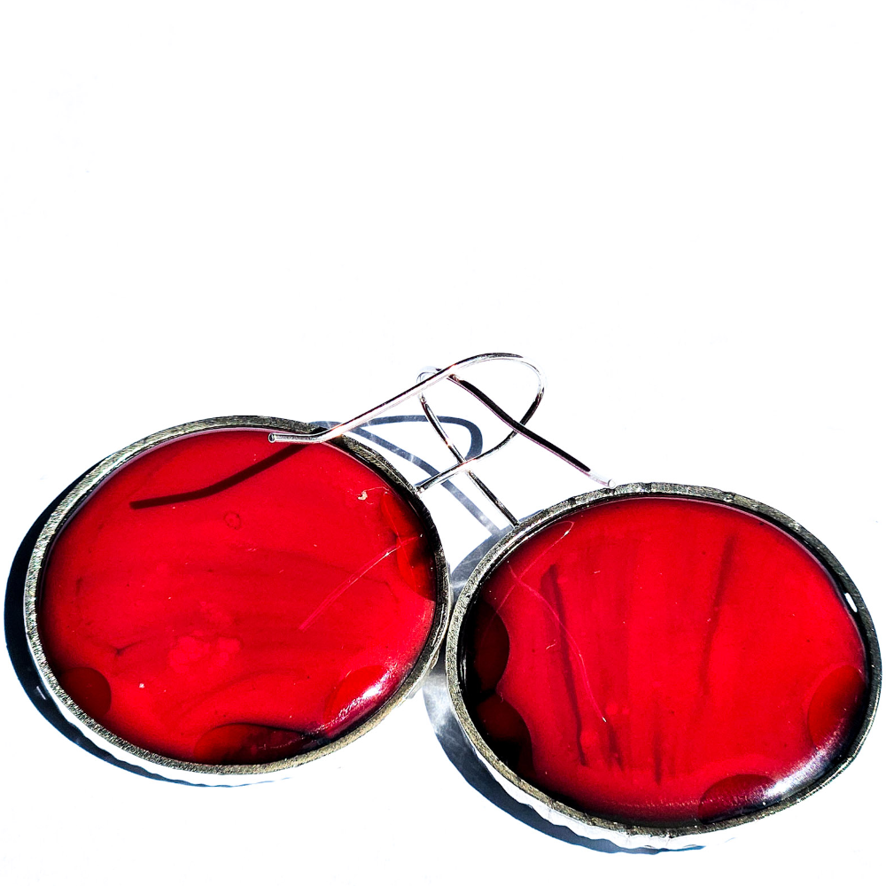 The glass is made by fusing red glass with hand-punched and sawn sterling silver, forming the Honeytrap pattern. The silver on the surface reacts during firing to produce blue and green tones, creating contrast against the red glass beneath.