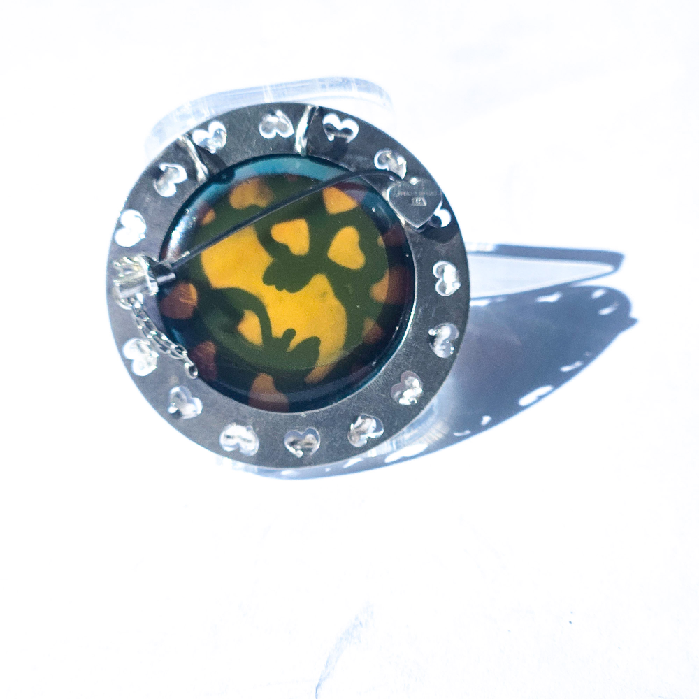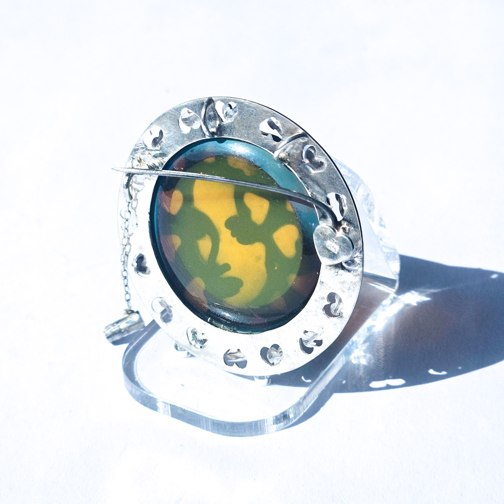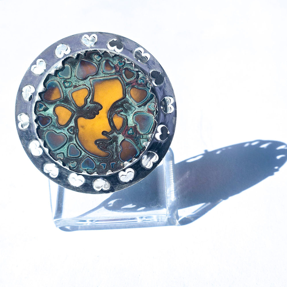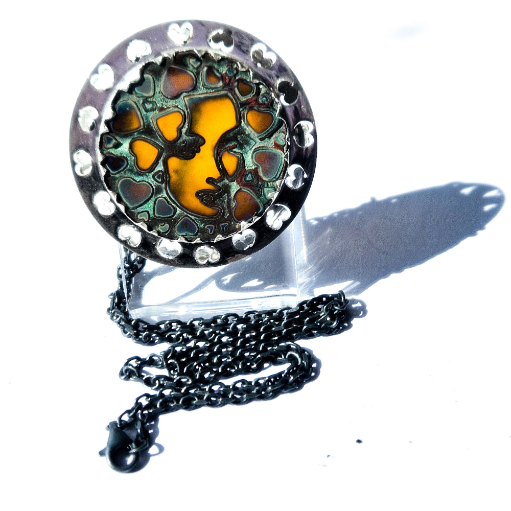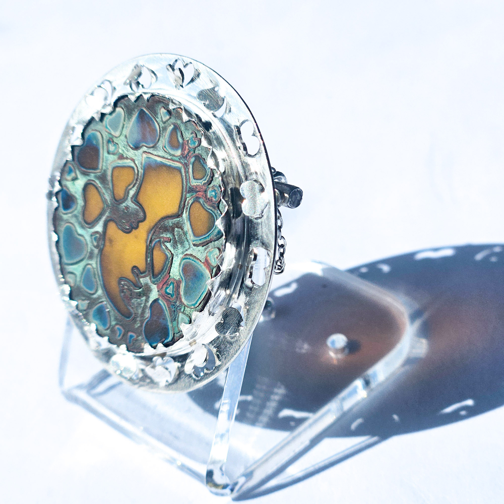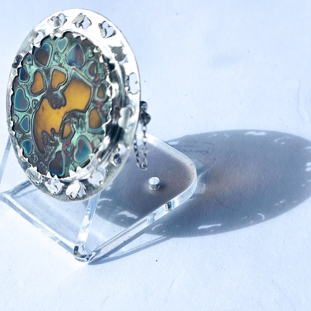 The glass jewel is made by fusing copper with amber glass, incorporating the Shirley design with heart-shaped details. The copper is then removed, leaving the patina on the glass.