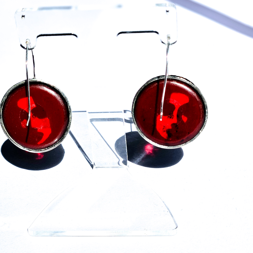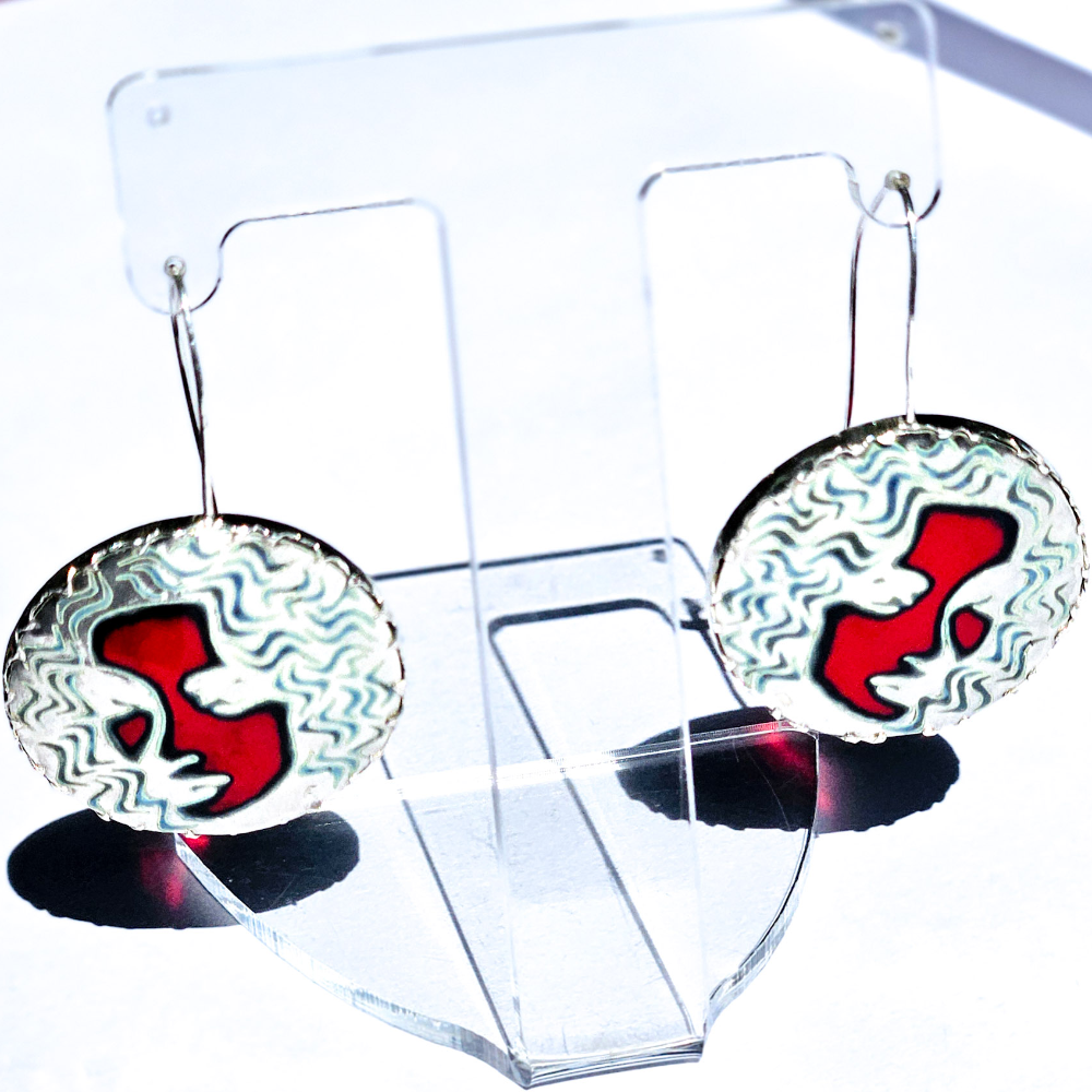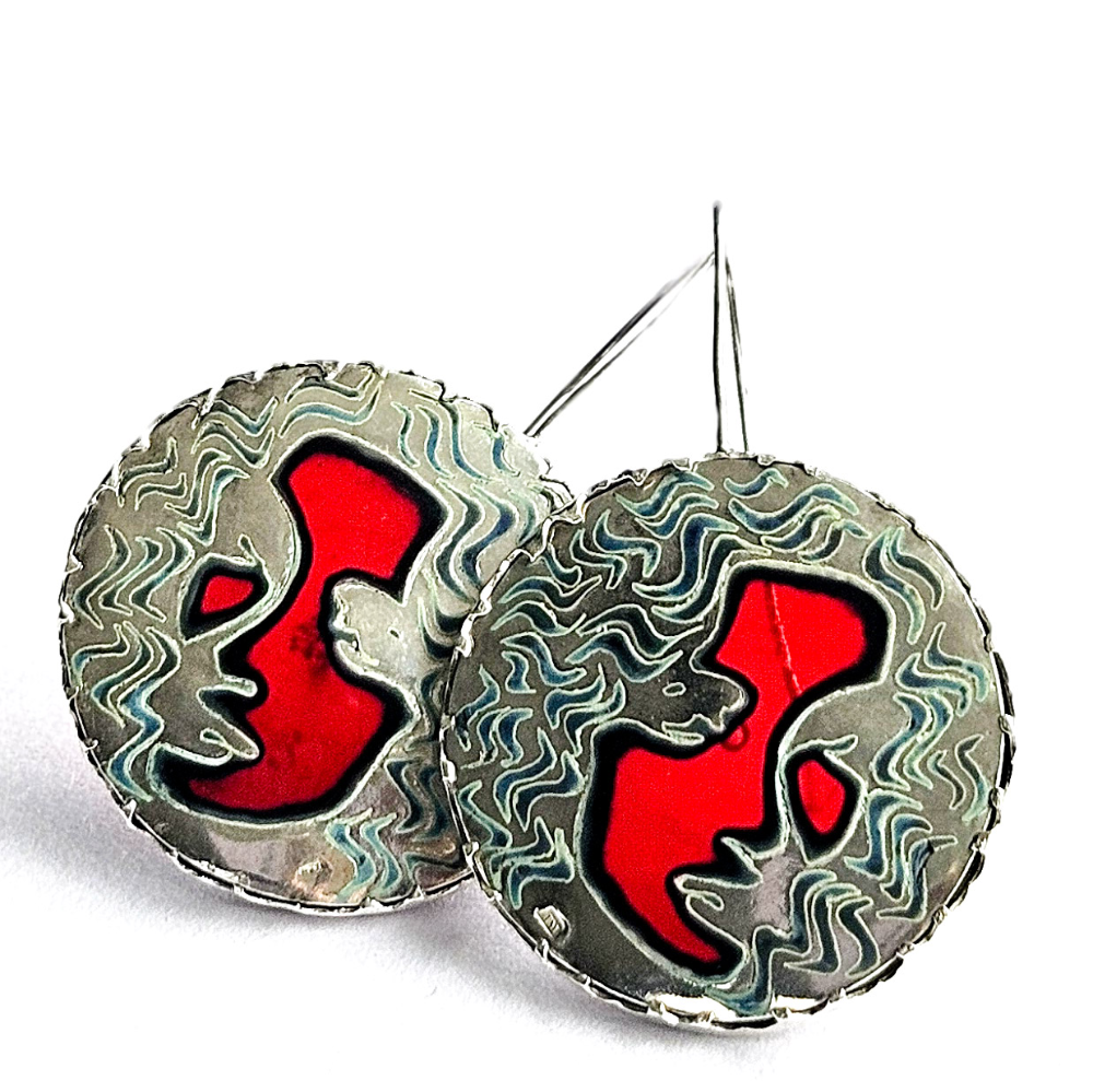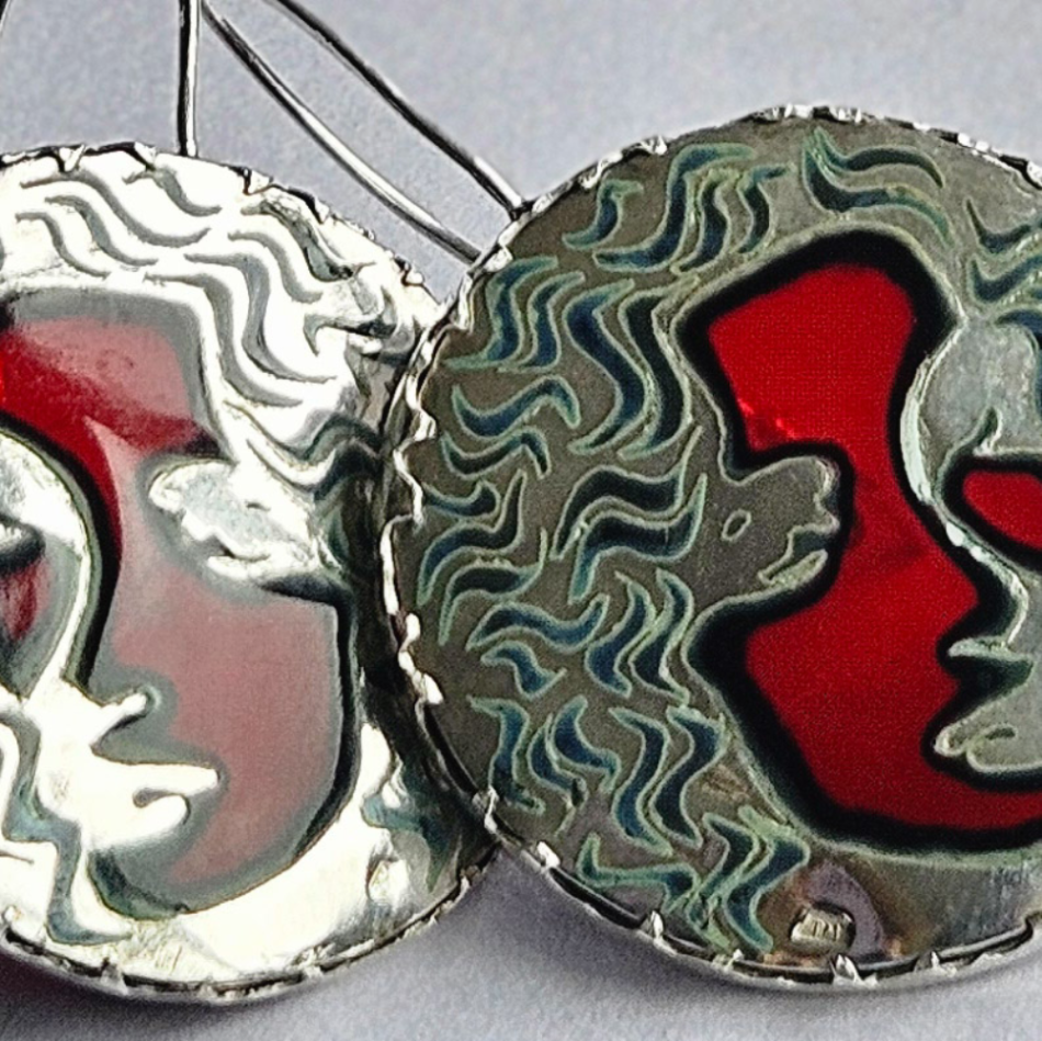 The glass is made by fusing red glass with hand-punched and sawn sterling silver, forming the Shirley face. A natural reaction between the glass and metal creates a blue outline around the hair and a darker outline around the face, giving definition and contrast against the red glass.