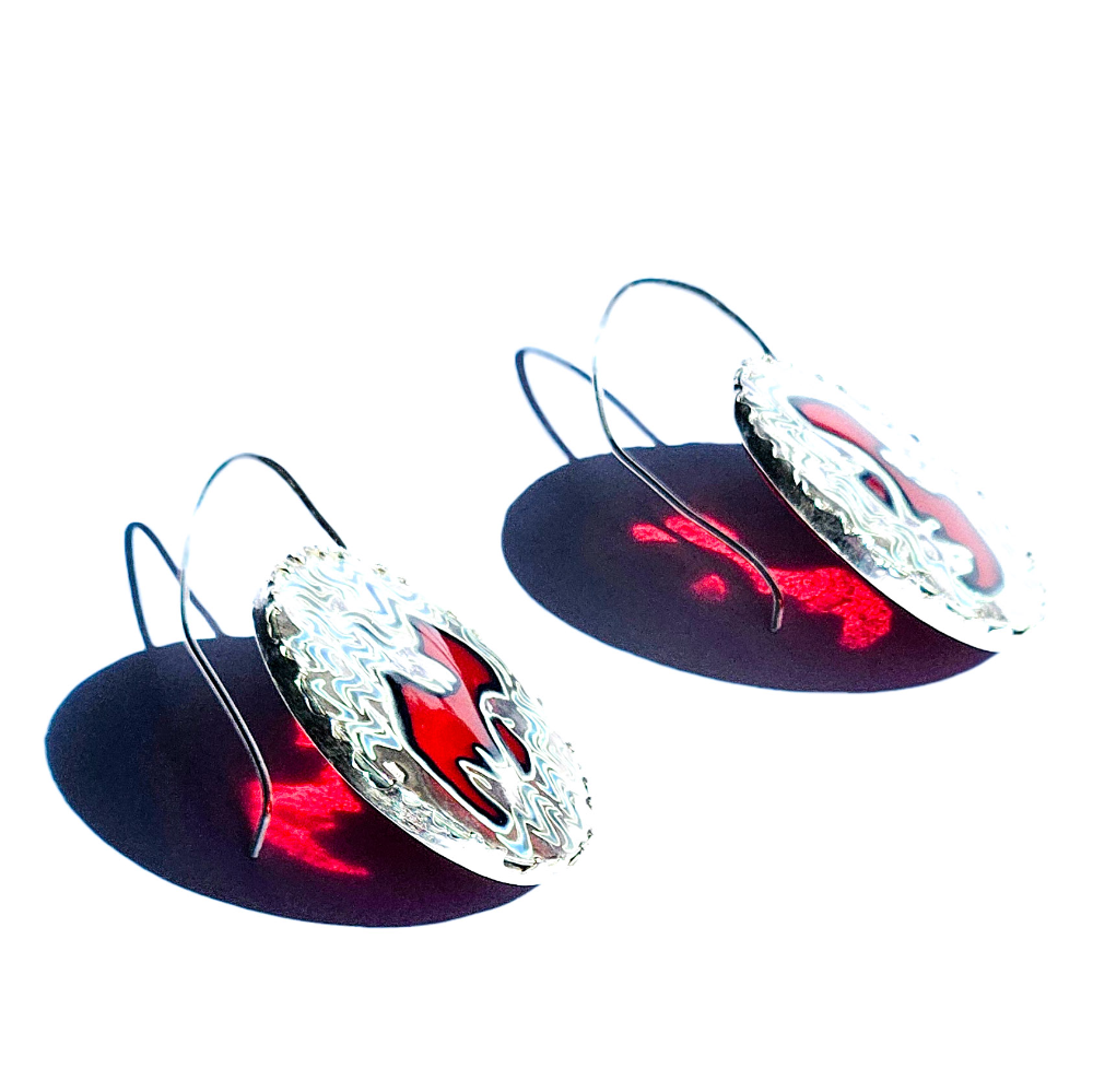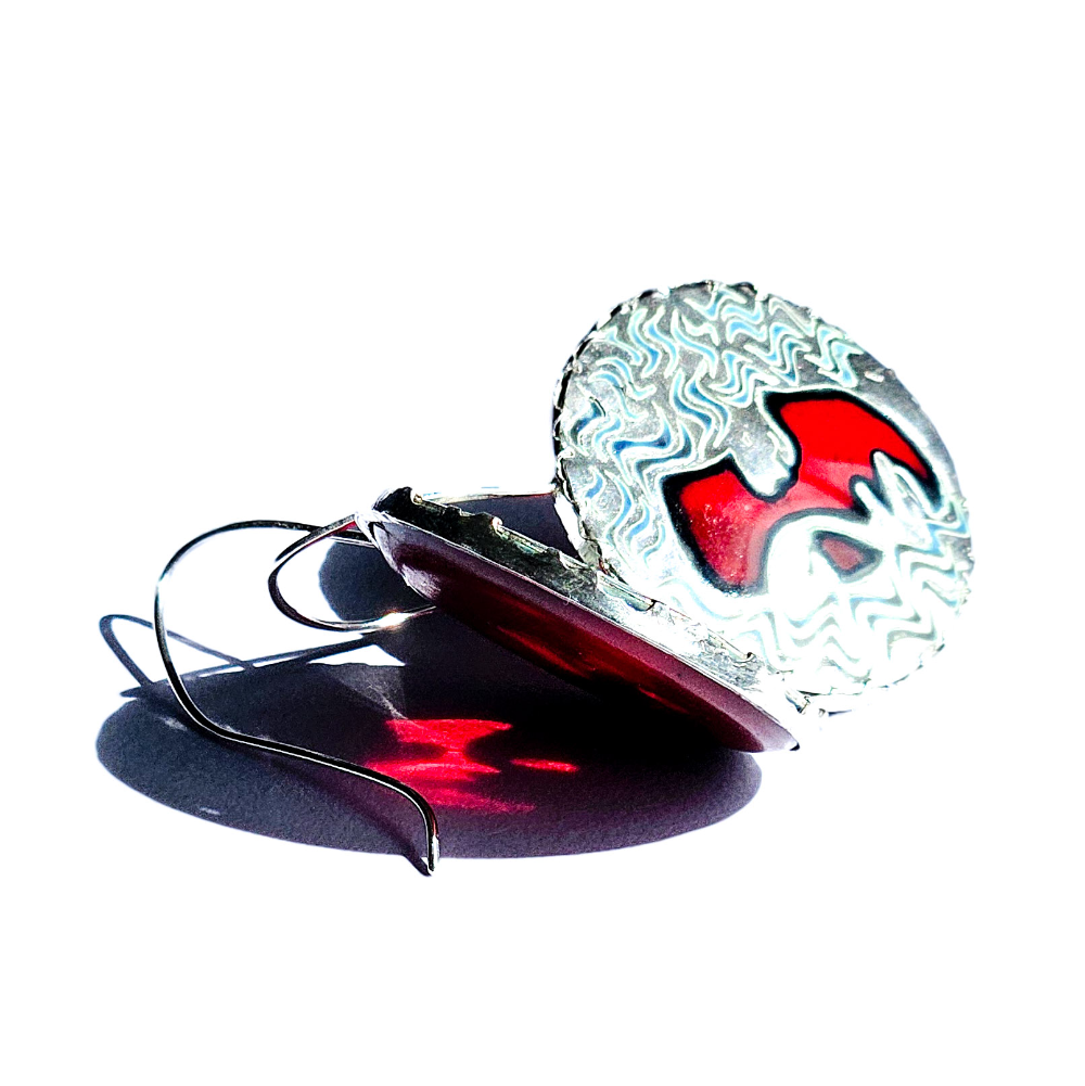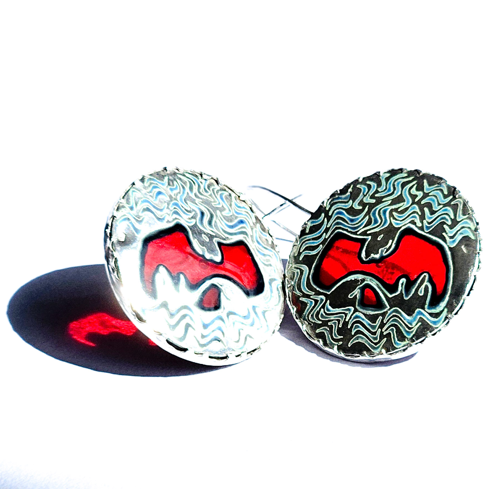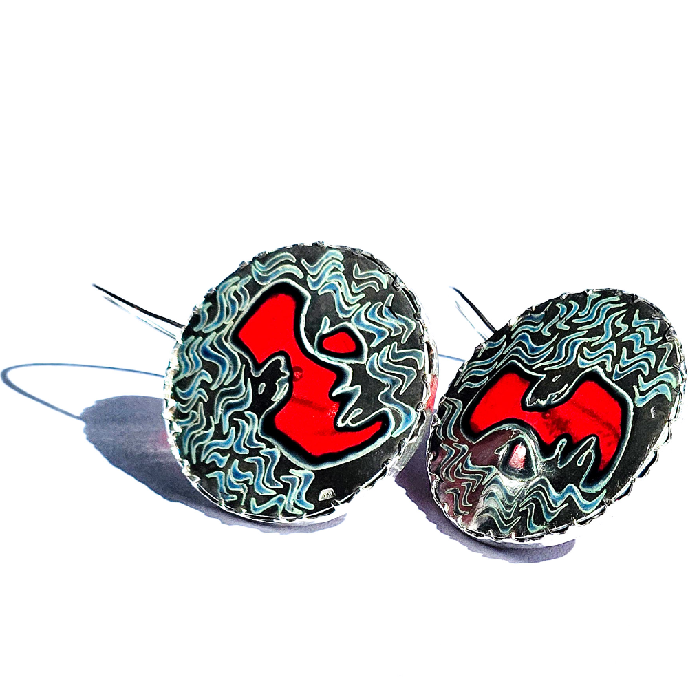 The glass is made by fusing red glass with hand-punched and sawn sterling silver, forming the Shirley face. A natural reaction between the glass and metal creates a blue outline around the hair and a darker outline around the face, giving definition and contrast against the red glass.