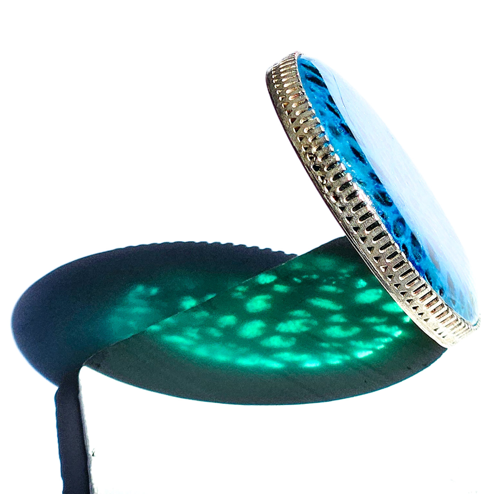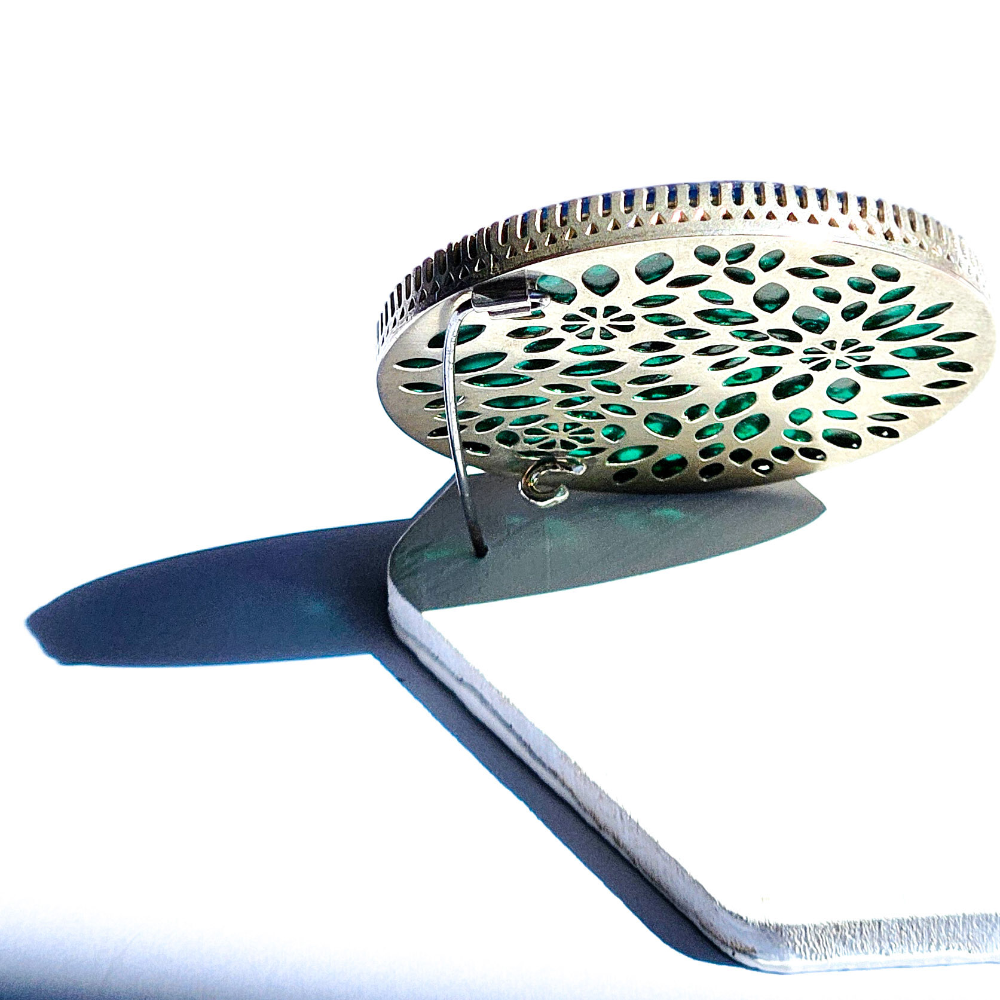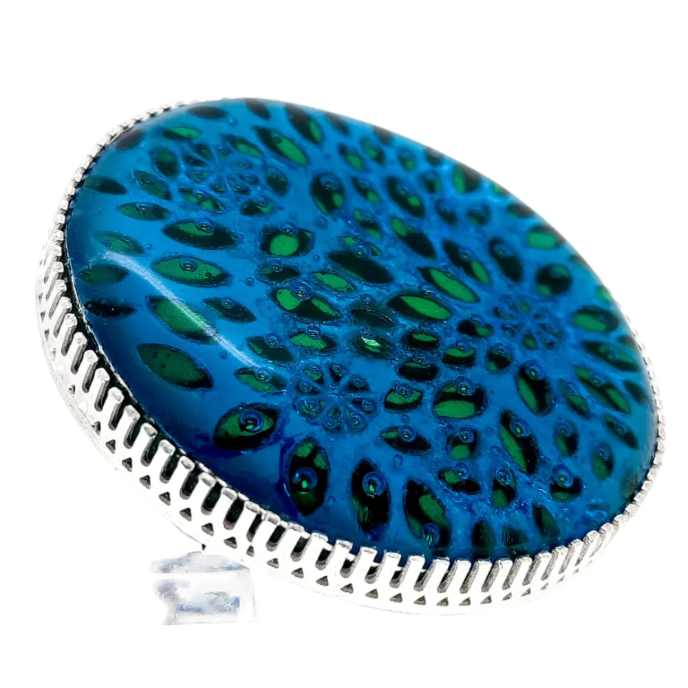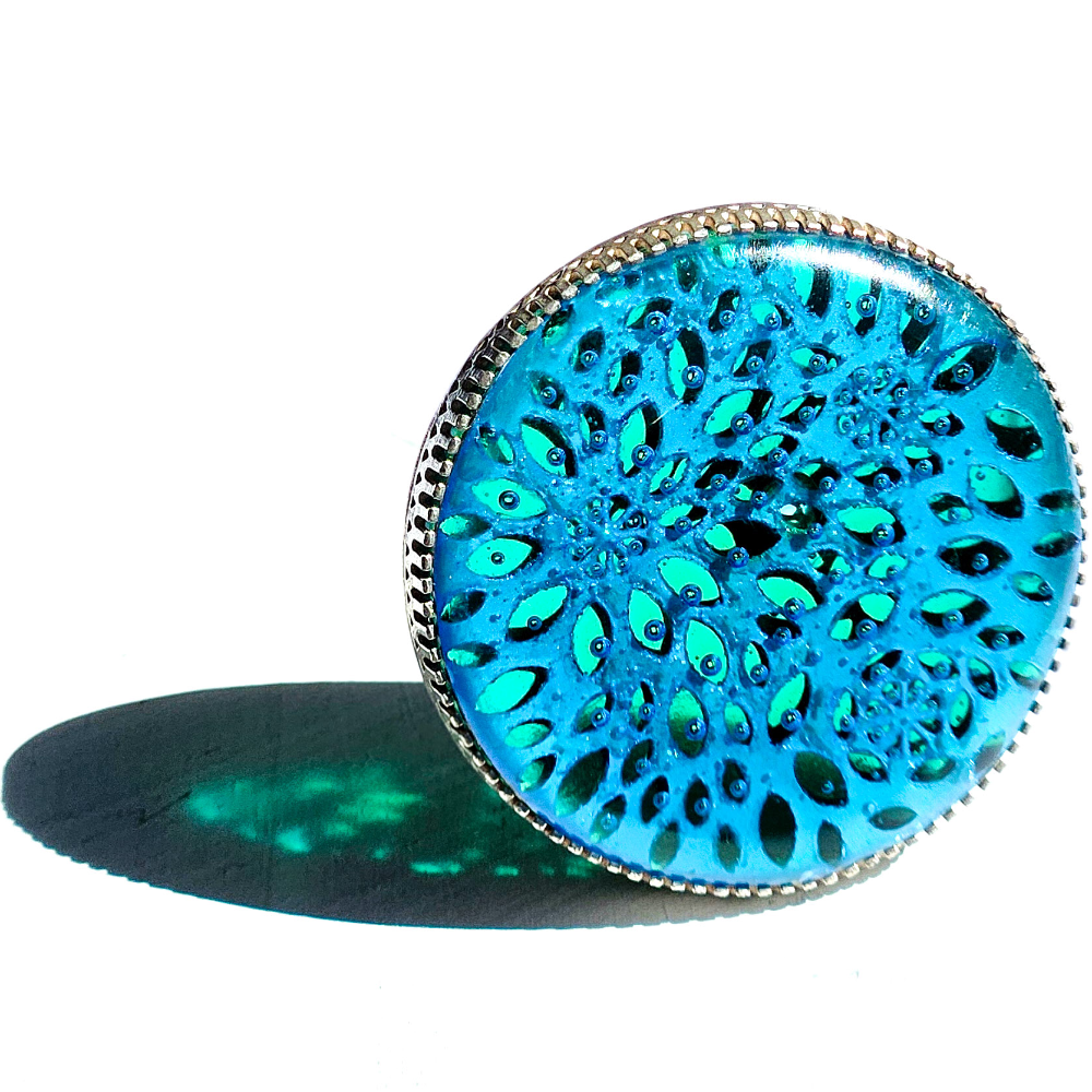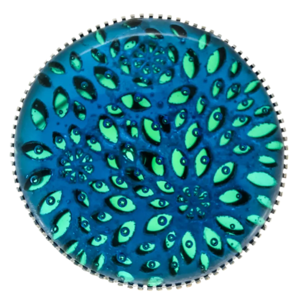 The glass is formed in two layers, blue and green, fused together in the kiln with a hand-pierced and sawn layer of silver between them.