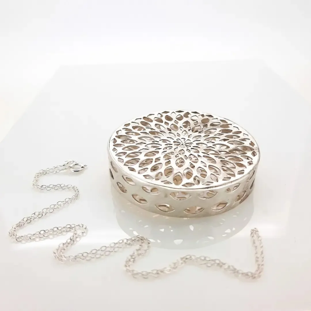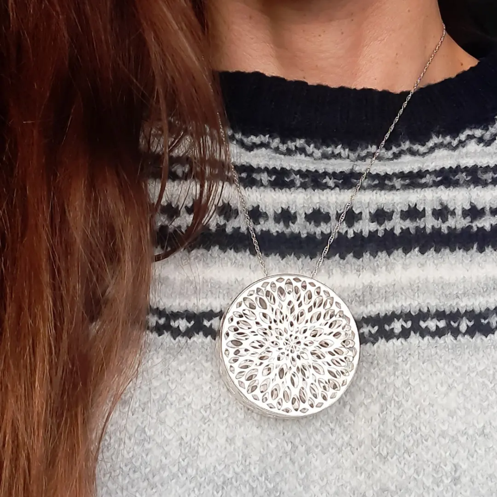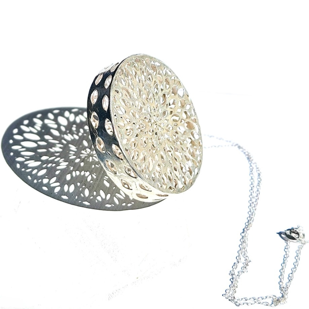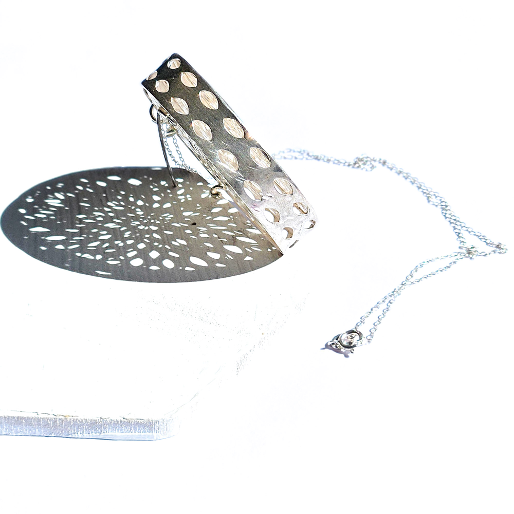 Three discs of sterling silver, each hand-pierced and sawn in the Tearjerker MK2 design. The layers sit together to create depth and movement as light passes through the pattern.
