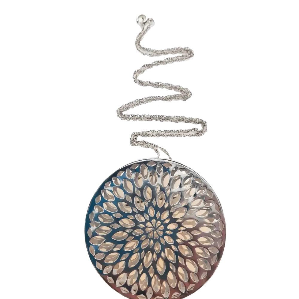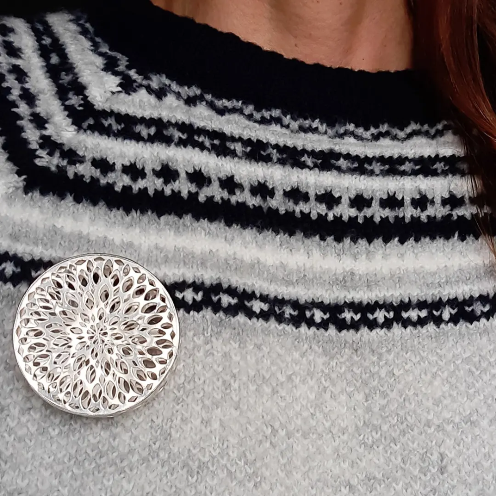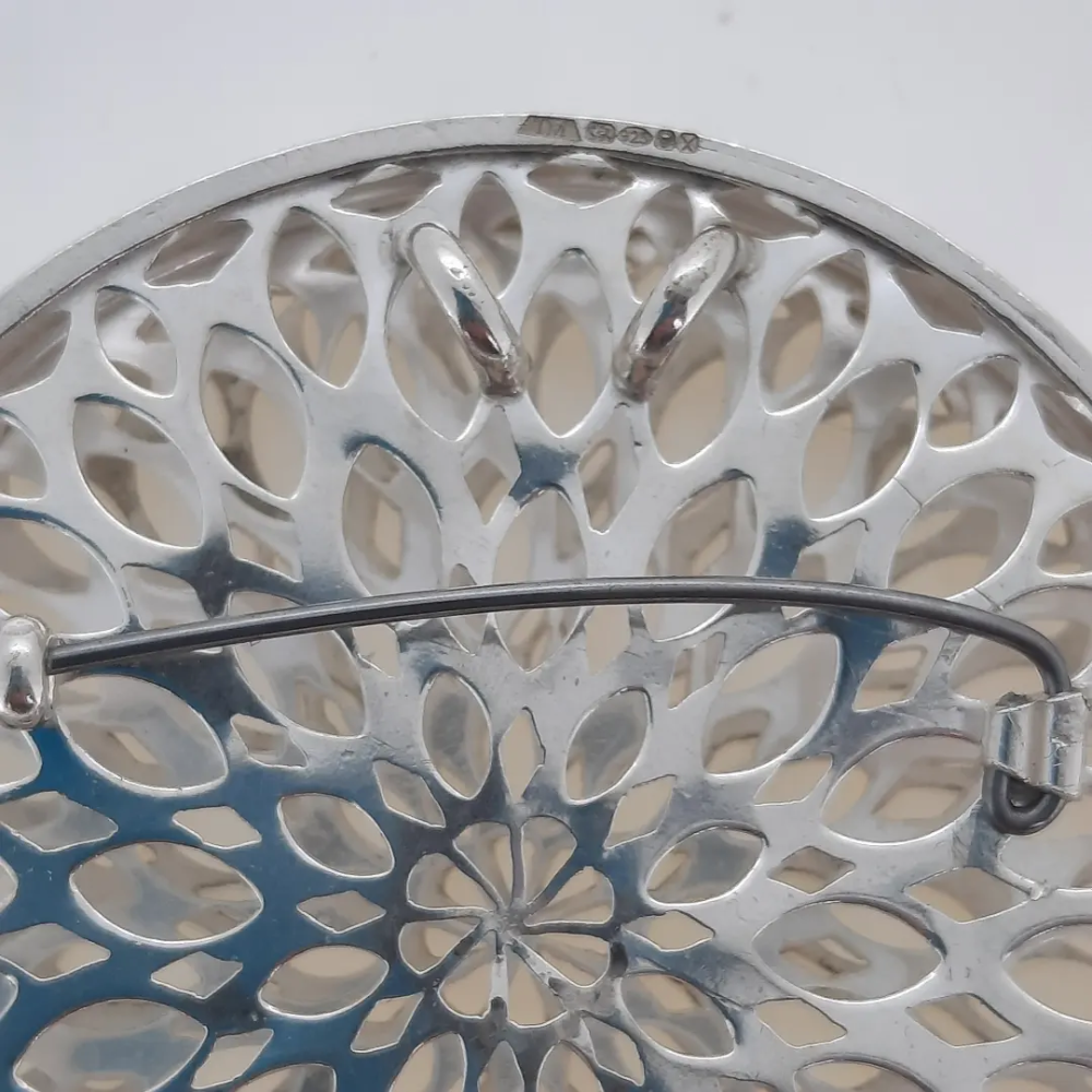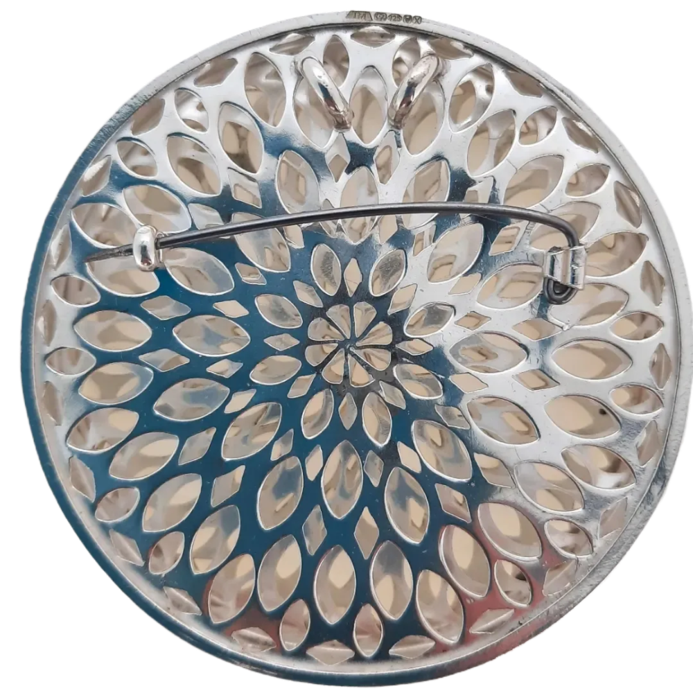 Three discs of sterling silver, each hand-pierced and sawn in the Tearjerker MK2 design. The layers sit together to create depth and movement as light passes through the pattern.