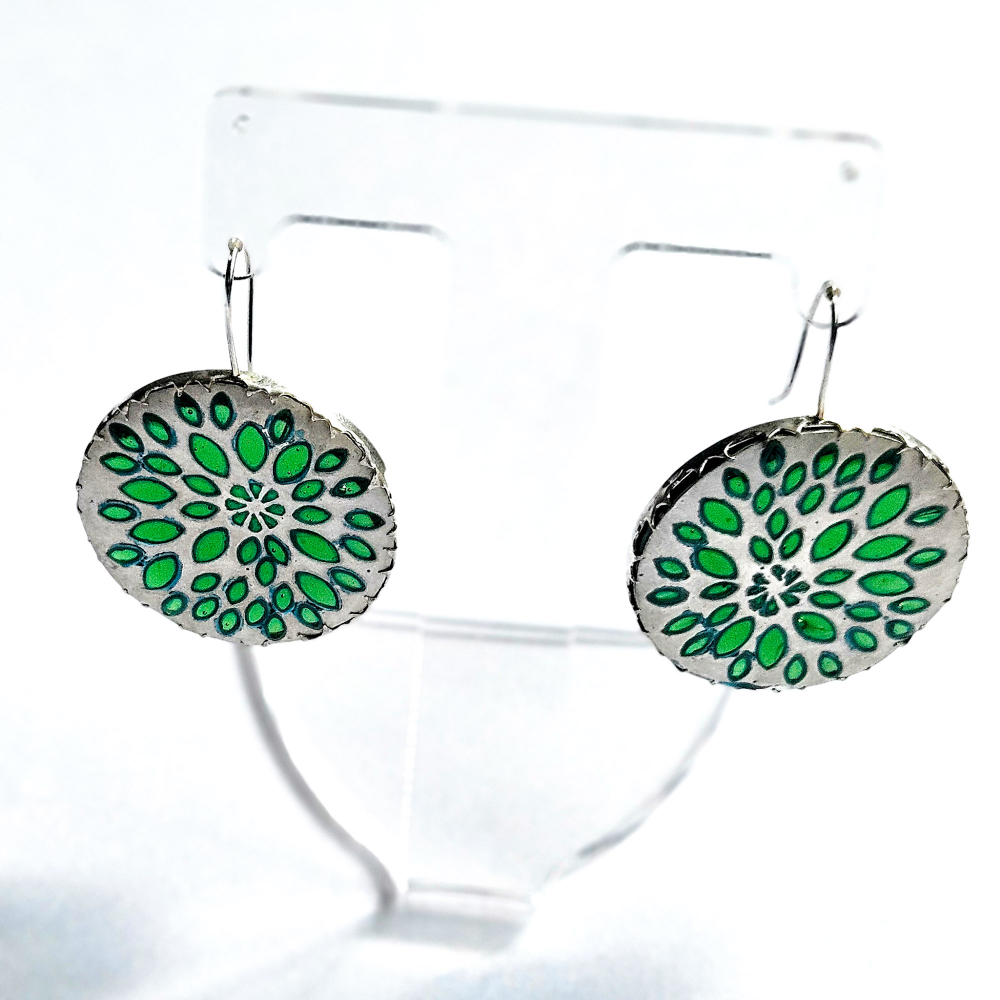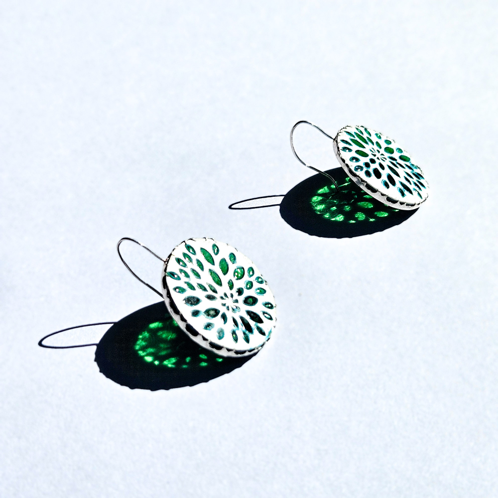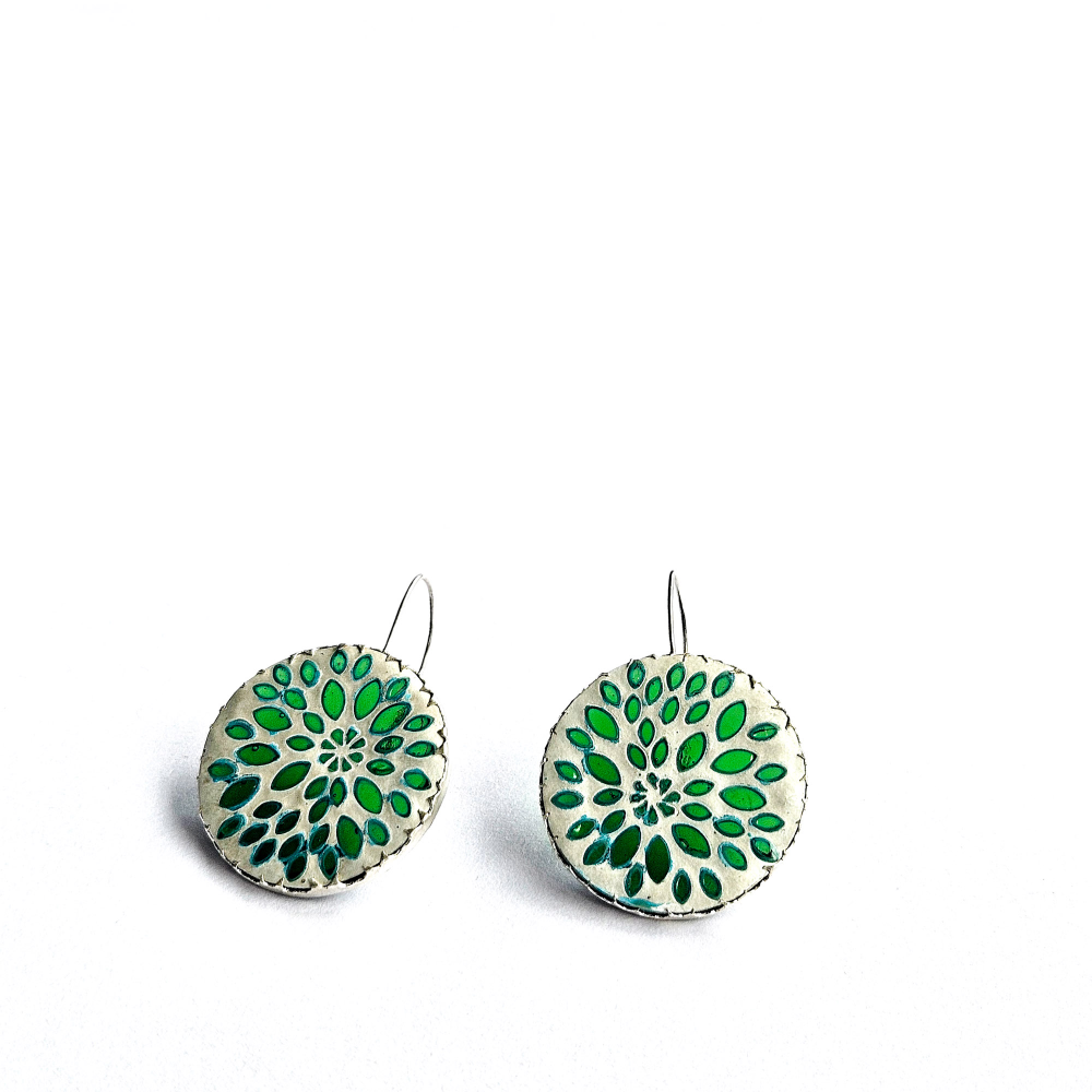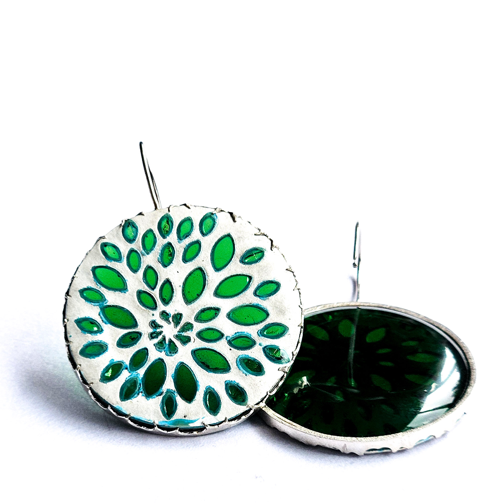 Earrings made in sterling silver with a whitened finish and green glass.
