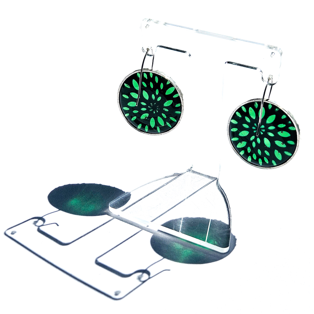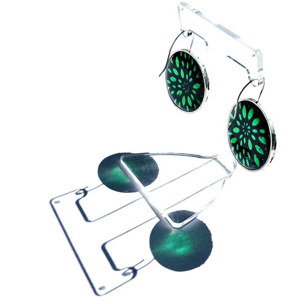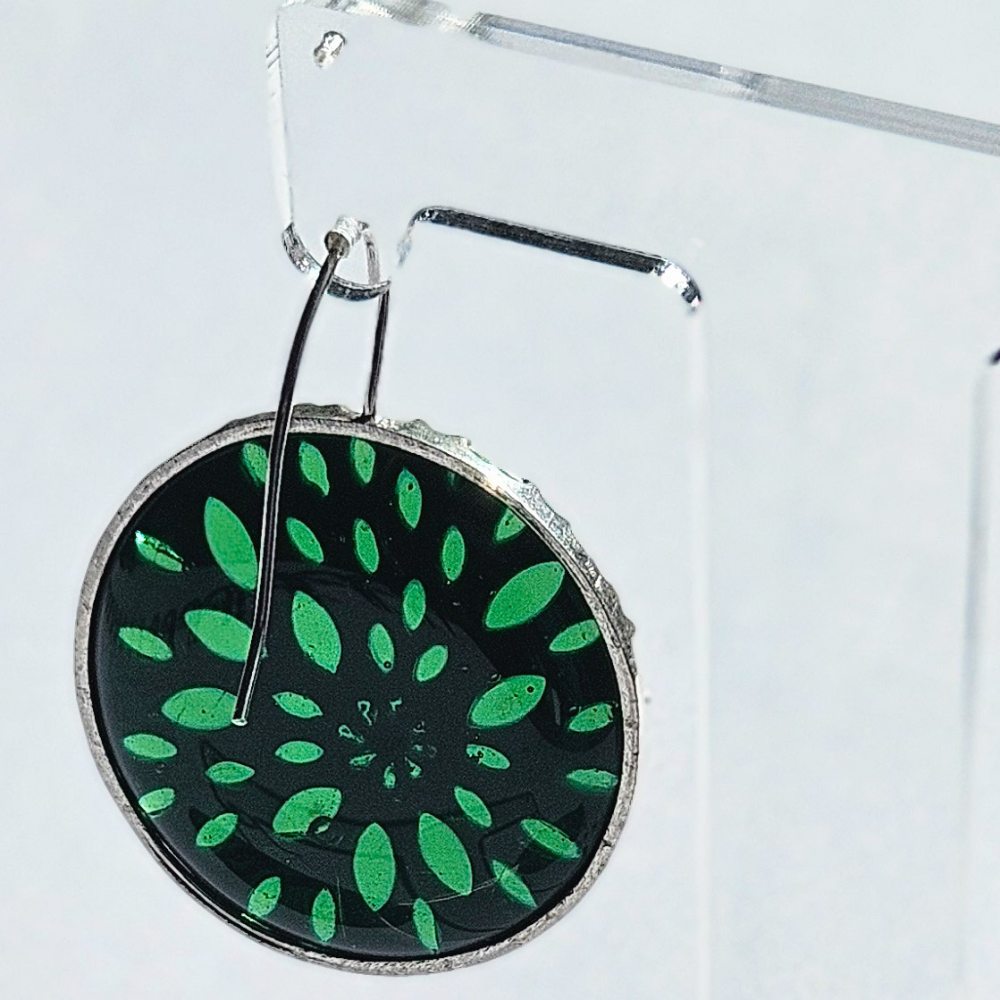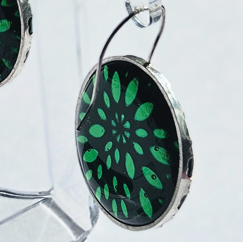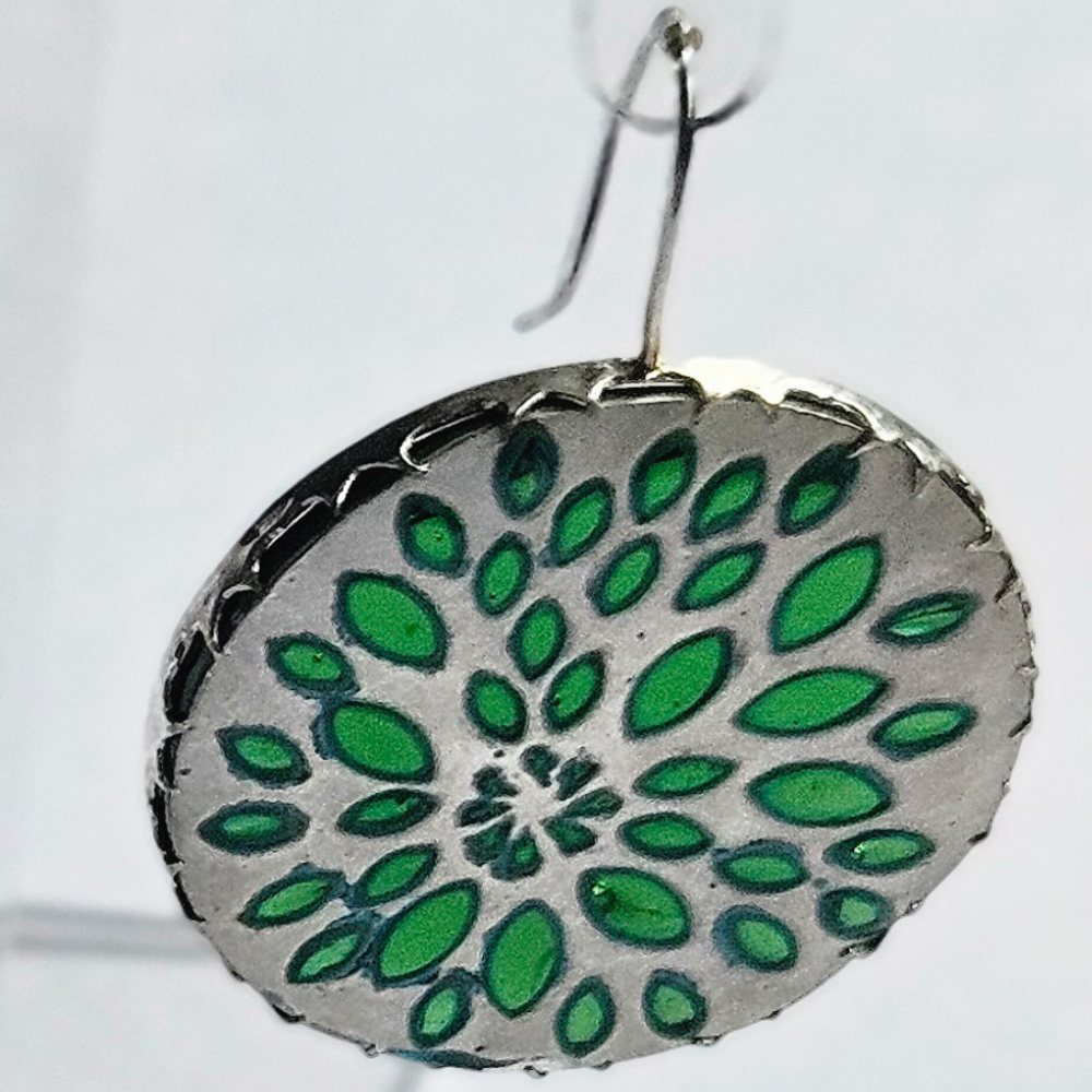 Earrings made in sterling silver with a whitened finish and green glass.